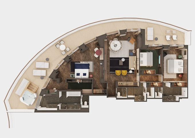 H3 - The Haven Deluxe Owner's Suite s veľkým balkónom 92-94 m² / balkón 57 - 68 m². 13. - 15. paluba, Max 2-6 osoby. Výhody The Haven. 33 528 € 16 764 € za osobu