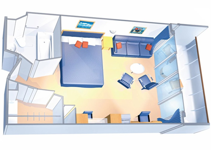VO - Ocean View Suite (bez balkónu) 49 m². Veľké neotvárateľné okná. Max 6-8 osôb. Výhody Suite. 4 569 € 1 523 € za osobu